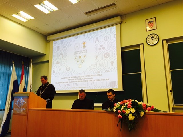 OSIJEK, 15. svibnja 2015. – Elektrotehnički fakultet u Osijeku (ETF), koji djeluje pri Sveučilištu Josipa Jurja Strossmayera, obilježio je danas 37. obljetnicu svog djelovanja. Tom prigodom, održana je i svečana sjednica Fakultetskog vijeća na kojoj su dodijeljene i nagrade najuspješnijim studentima. Svečanoj sjednici nazočili su i dr. sc. Dražen Lučić, predsjednik Vijeća i mr. sc. Mario Weber, ravnatelj Hrvatske regulatorne agencije za mrežne djelatnosti (HAKOM-a).