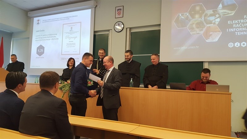 ZAGREB, 20. svibnja 2016. - Fakultet elektrotehnike, računarstva i informacijskih tehnologija (FERIT) u Osijeku, koji djeluje pri Sveučilištu Josipa Jurja Strossmayera, obilježio je danas 38. obljetnicu svog djelovanja. Tom prigodom, održana je i svečana sjednica Fakultetskog vijeća na kojoj su dodijeljene i nagrade najuspješnijim studentima. Svečanoj sjednici nazočili su i dr. sc. Dražen Lučić, predsjednik Vijeća i mr. sc. Mario Weber, ravnatelj Hrvatske regulatorne agencije za mrežne djelatnosti (HAKOM-a).