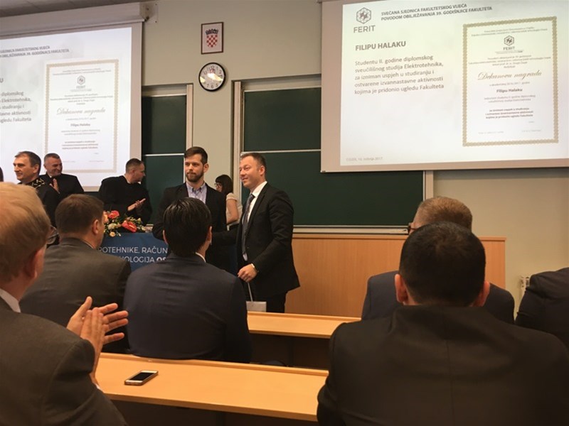 ZAGREB, 18. svibnja 2017. - Fakultet elektrotehnike, računarstva i informacijskih tehnologija (FERIT) u Osijeku, koji djeluje pri Sveučilištu Josipa Jurja Strossmayera, obilježio je ovoga tjedna 39. obljetnicu svog djelovanja. Tom prigodom održana je i svečana sjednica Fakultetskog vijeća na kojoj su dodijeljene nagrade najuspješnijim studentima. Svečanoj sjednici nazočili su dr.sc. Dražen Lučić, predsjednik Vijeća, i mr. sc. Mario Weber, ravnatelj Hrvatske regulatorne agencije za mrežne djelatnosti (HAKOM-a), koji je i uručio nagradu HAKOM-a.